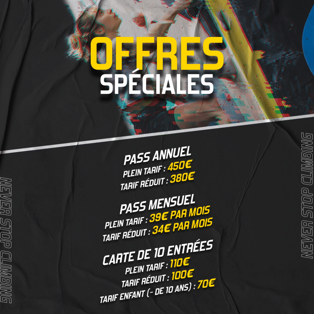 Tout le mois d’avril, en parallèle de notre offre spéciale découverte de l’escalade, Vertical’Art Le Mans vous propose des tarifs ultra avantageux et uniques sur le marché de la grimpe sur les abonnements mensuel et annuel et les cartes de 10 entrées.