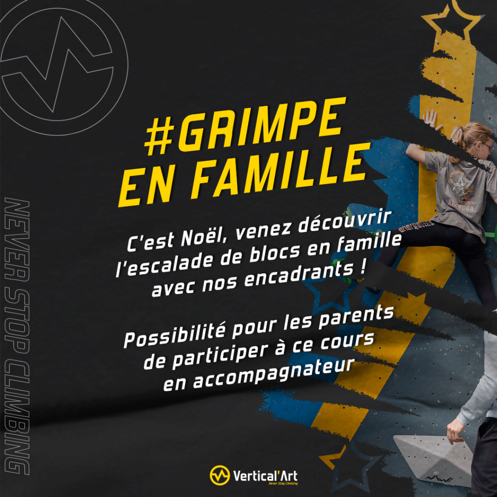 Rendez-vous à Vertical’Art Le Mans pour nos séances spéciales Grimpe En Famille ! Initiez-vous à l’escalade en bloc dans une ambiance ludique et festive, idéale pour petits et grands.