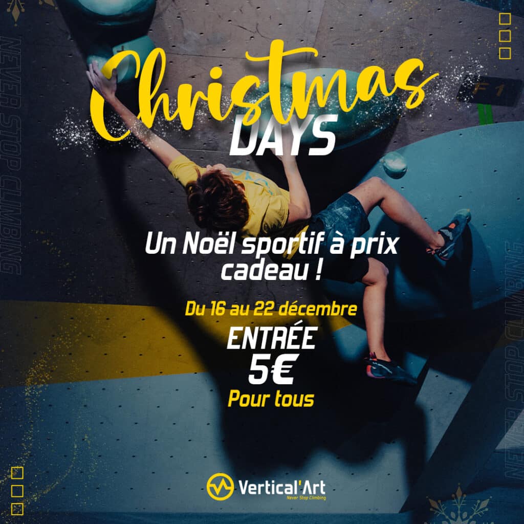 Les Christmas Days, c’est une semaine organisée pour offrir à tous la possibilité de découvrir ou redécouvrir l’escalade, à un tarif ultra-accessible. Avec cette offre spéciale, nous souhaitons rendre l’escalade accessible à tous, qu’il s’agisse d’une première expérience ou d’un retour sur le mur pour les passionnés.