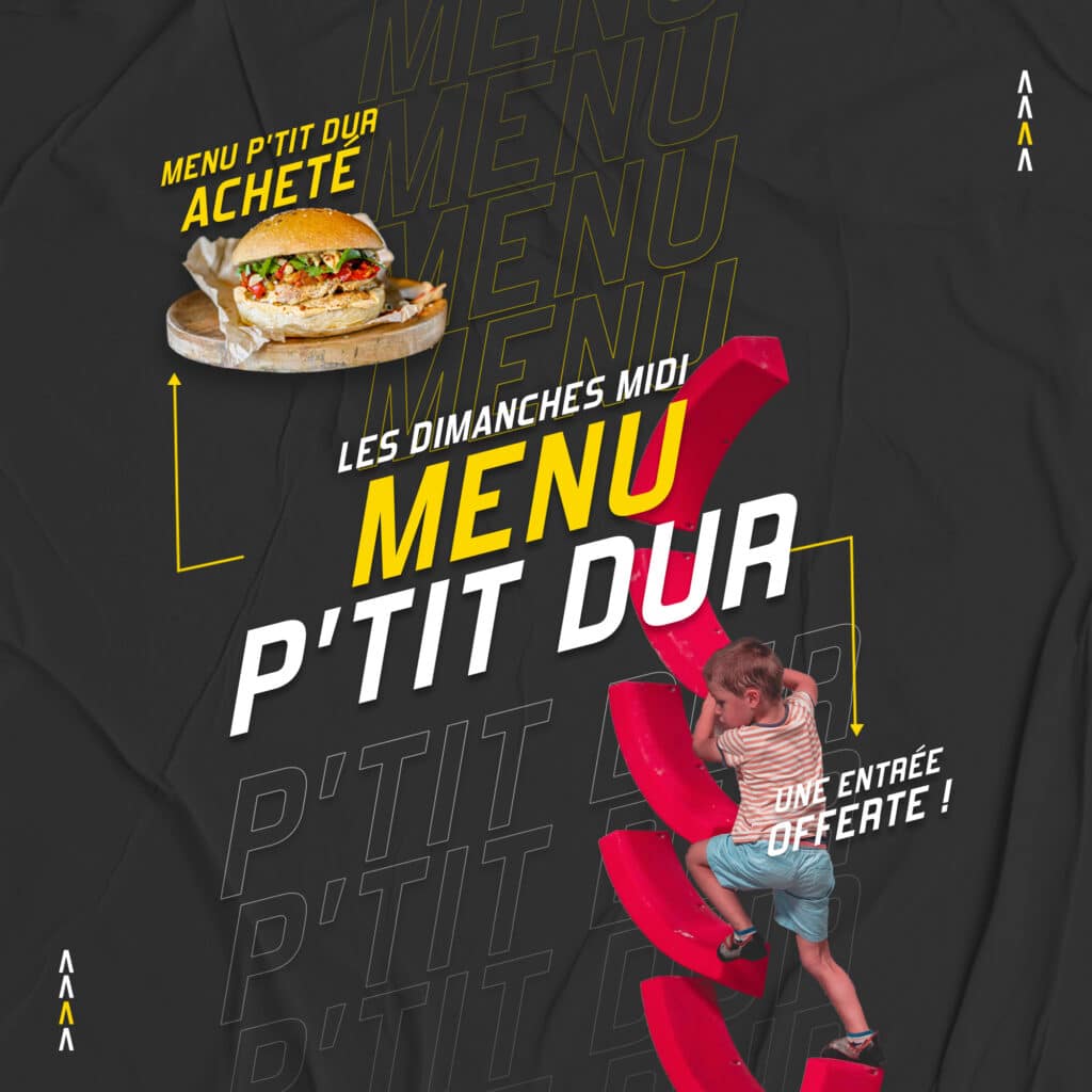 🍽 Offre : Pour 1 menu P’tit Dur acheté → 1 entrée d’escalade enfant offerte (valable le même jour)